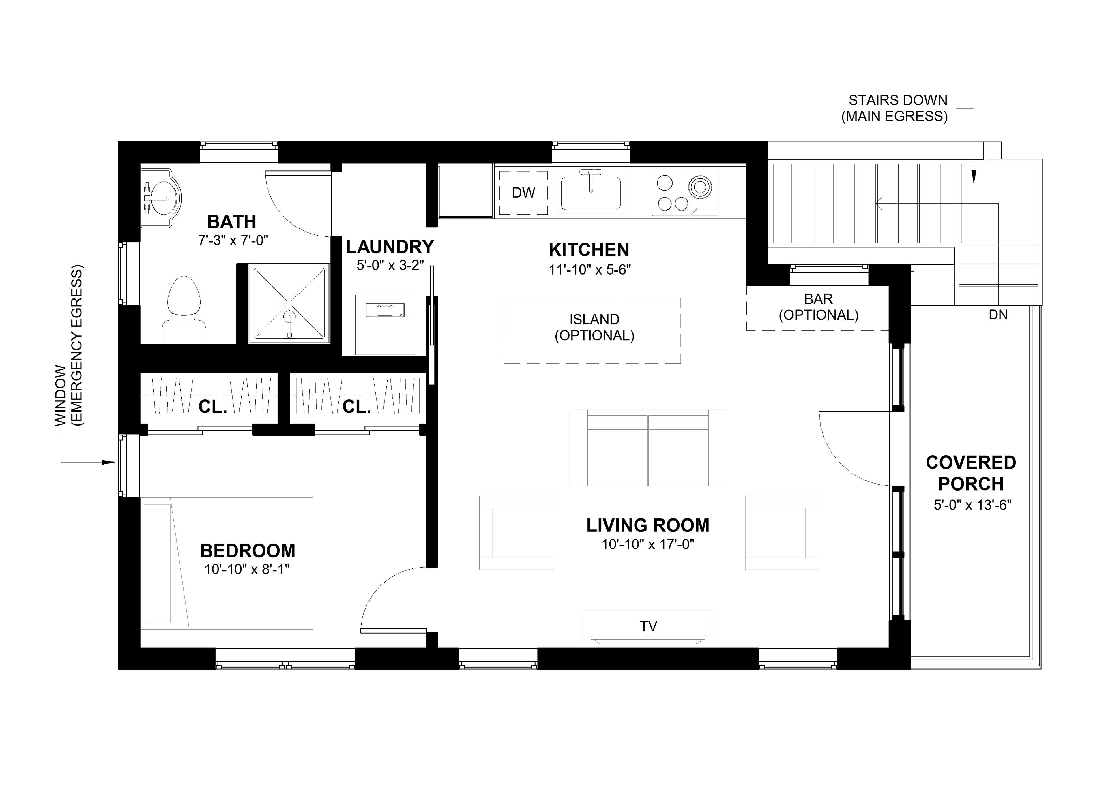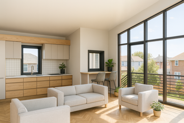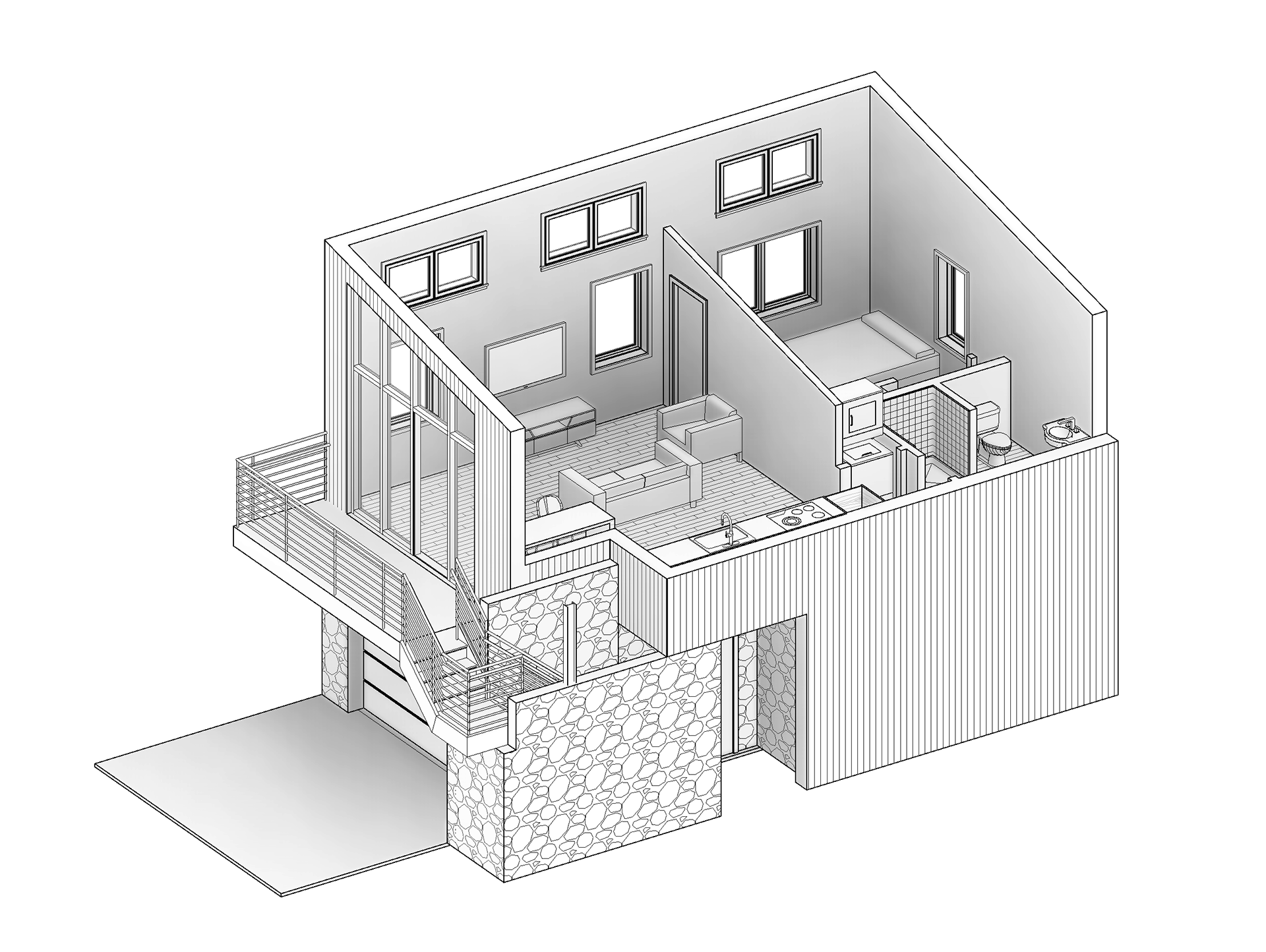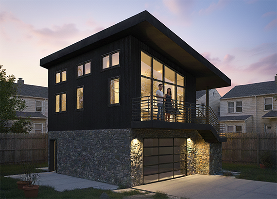 A compact, light-filled one-bedroom apartment set above a garage, tailored for NYC’s City of Yes ADU program and the Pre-Approved Plan Library. A private exterior stair leads to a cantilevered balcony entry; inside, the living room, kitchenette, bedroom, and bath meet Light & Air and energy requirements. Sized for typical one- and two-family backyards, it preserves parking while creating income, guest, or multigenerational space. Pre-approved details streamline permitting and construction.